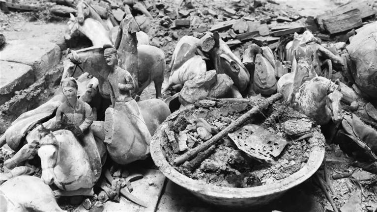 甬道及墓室內(nèi)隨葬品眾多,有彩繪陶、漆木、石、銅、鐵、金銀器及革制和絲麻織品等,共計(jì)220余件組。從發(fā)掘現(xiàn)場(chǎng)來看,這座墓葬保存非常完整,沒有被盜和攪擾的痕跡。