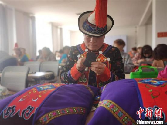 圖為裕固族服飾非遺傳承人為學(xué)員傳授傳統(tǒng)服飾刺繡?!∈缝o靜 攝