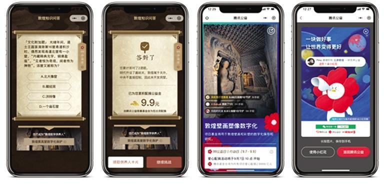 “云游敦煌”的“聲動(dòng)畫(huà)語(yǔ)”讓壁畫(huà)“活”了起來(lái),用戶可以通過(guò)觸點(diǎn)的方式進(jìn)入到不同的篇章中,通過(guò)動(dòng)畫(huà)欣賞敦煌壁畫(huà)中晚唐時(shí)期的生活場(chǎng)景,并獲得與當(dāng)時(shí)社會(huì)民俗、服飾等相關(guān)的文化知識(shí)。觀看完動(dòng)畫(huà)后,用戶還可以通過(guò)參與文化問(wèn)答挑戰(zhàn),為中國(guó)敦煌石窟保護(hù)基金會(huì)募集善款。答對(duì)題目越多,募集到的善款也將隨之增多。款項(xiàng)將由騰訊公益慈善基金會(huì)直接出資,并全部用于敦煌莫高窟第427窟、145窟、138窟的數(shù)字化保護(hù)工程。通過(guò)這種方式讓每一位參與的用戶,都能夠用自己的知識(shí)為石窟數(shù)字化保護(hù)助力,成為新時(shí)代的敦煌“數(shù)字供養(yǎng)人”。