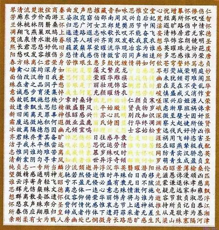 蘇蕙《璇璣圖》不僅是一束厚重的文學(xué)奇葩,也是一幅充滿(mǎn)創(chuàng)意的藝術(shù)巨制。她將詩(shī)歌的載體從傳統(tǒng)簡(jiǎn)帛紙張轉(zhuǎn)換成為錦。錦是有彩色花紋的高級(jí)絲織品。以錦為書(shū)寫(xiě)材料制作《璇璣圖》,除詩(shī)歌本身的創(chuàng)作外,首先需要染絲紡織。錦織好后,又要對(duì)《璇璣圖》謀篇布局,劃區(qū)設(shè)色,書(shū)詩(shī)于錦,然后一針一針地將它繡出來(lái),變?yōu)榛匚腻\字。那每一道工序,要求都極精細(xì),不得有半點(diǎn)疏忽,不然就會(huì)留下污點(diǎn)和遺憾。蘇蕙集眾藝于一身,完美地將其制作出來(lái),體現(xiàn)了她的綜合藝術(shù)才能。取名“璇璣(泛指北斗)圖”,寓意它像北斗,可以旋轉(zhuǎn)地讀。它是在華美的錦上,又以五彩繽紛的絲線(xiàn)繡上《璇璣圖》,不僅顏色更加艷麗,而且那841個(gè)金玉珠璣般文字,展現(xiàn)的令人眼花繚亂的詩(shī)歌園地,更是前不見(jiàn)古人,后不見(jiàn)來(lái)者,比錦繡的光彩更加耀眼奪目。
