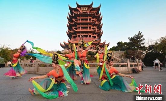 11月27日,伴著幽幽古樂(lè),“飛天仙子”在“江南三大名樓”之一的黃鶴樓前演繹敦煌舞?!「拭C省文化和旅游廳供圖