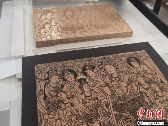 “將敦煌壁畫濃縮雕刻在木板上難度非常大,飛天裙裾要飄逸,菩薩的眉眼要有神,一刀都不能雕錯(cuò)。”徐晉林最近剛完成以莫高窟444窟和57窟的壁畫為原型的雕版畫,目前累計(jì)完成上百件敦煌題材的雕版畫。