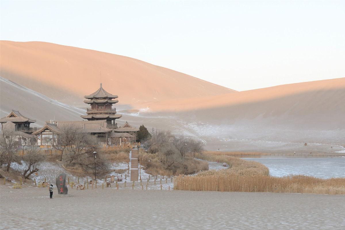 敦煌月牙泉因酷似一彎新月而聞名于世,冬季的月牙泉更像一位嫻靜的少女依偎在鳴沙山的懷抱。2021年12月10日晚,一場紛紛揚(yáng)揚(yáng)的小雪悄悄降臨敦煌大漠,月牙泉宛如披上一層薄薄的輕紗,靜美如畫,令人流連忘返。