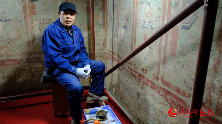 敦煌研究院文物保護修復工作者劉濤在工作現場。人民網 呂強攝