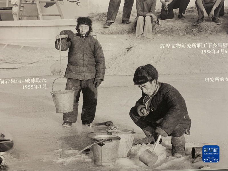 展覽的第二部分,主要呈現1944年“國立敦煌藝術研究所”成立后,幾代文化工作者扎根大漠、開拓進取的歷程。該部分展出了大量老照片,如上世紀五六十年代,文化工作者破冰取水、耕作勞動的場景。