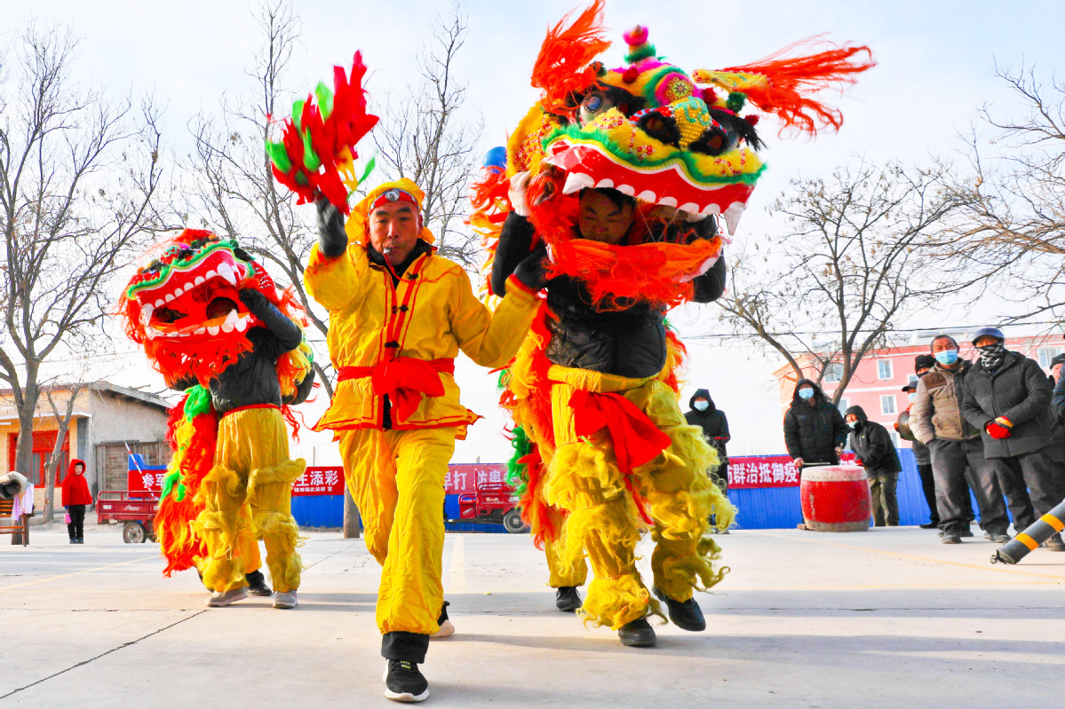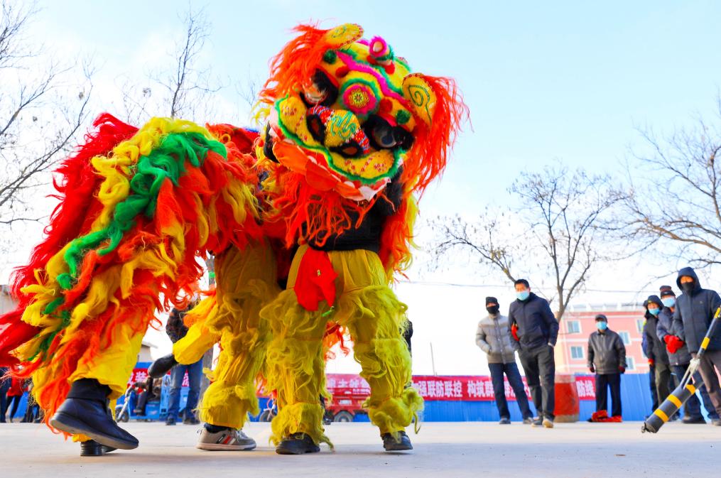 1月26日,甘肅省張掖市甘州區(qū)堿灘鎮(zhèn)草湖村文化廣場(chǎng)上,村文化隊(duì)為鄉(xiāng)親們表演了獅頭擺,追繡球,飆起來(lái),威掃天下知的獅舞,迎接即將到來(lái)的新春佳節(jié)。