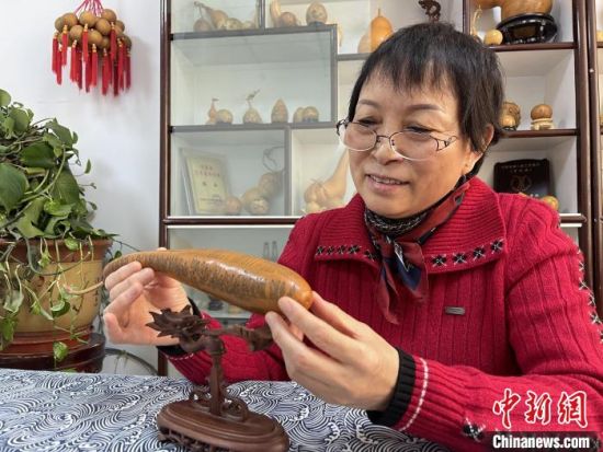 圖為長約二十公分的長條葫蘆雕刻佛教經(jīng)文作品。 張婧 攝