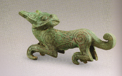 禮縣大堡子山祭祀樂器坑出土,共三只,造型相同,大小相似,為全國(guó)虎伴樂器出土的首例。其形象回首卷尾、聳耳曲爪、憨態(tài)可掬,極具觀賞性,是春秋時(shí)期虎造型的杰作,體現(xiàn)了秦國(guó)早期高超的造型能力和精湛的鑄造技術(shù)。虎的形象在春秋秦人的器物中多見,不但有自成個(gè)體的金虎、青銅回首虎,同時(shí)虎作為附飾也出現(xiàn)在一些大的青銅器上。