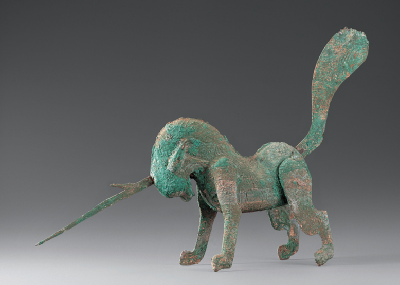 獸頭向前沖,角向前刺,扁尾上翹,四足跨張作角斗狀,全身鑄有獸毛的紋飾。角和尾可拆卸。獨(dú)角獸是傳說中的一種神獸,隨葬在墓中,起鎮(zhèn)墓辟邪的作用。