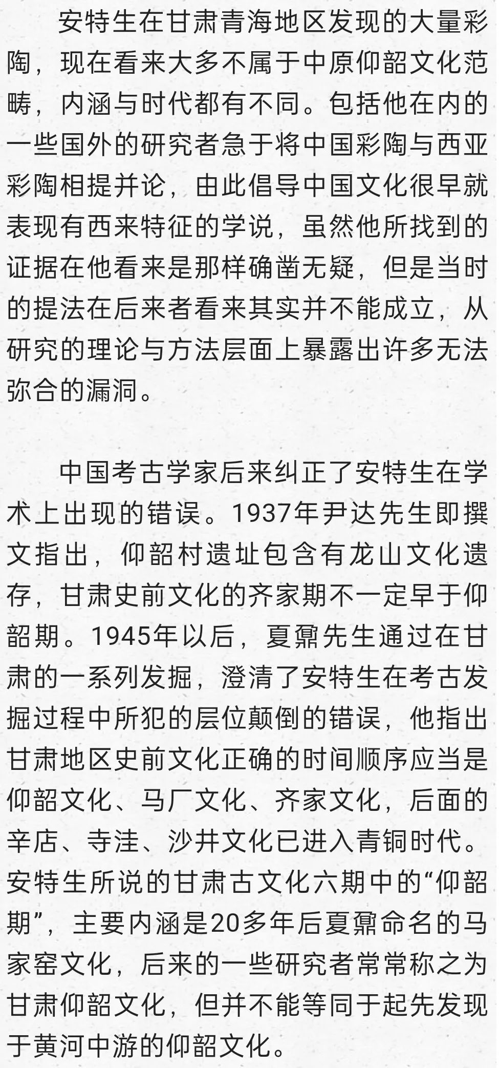 安特生從1923年開始沿黃河西行,去追溯仰韶文化和彩陶文化的源頭。他在甘肅和青海一帶發(fā)現(xiàn)了豐富的古文化遺存,發(fā)現(xiàn)了比中原數(shù)量更多的彩陶,這使得他流連忘返,一直在那里待了近兩個(gè)年頭。安特生發(fā)現(xiàn)六種考古學(xué)文化中都見到了彩陶,他認(rèn)為這些考古學(xué)文化處于新石器時(shí)代晚期到向青銅時(shí)代過渡的時(shí)期,絕對年代約在公元前3500年到1500年之間,包括仰韶在內(nèi)它們代表了6個(gè)發(fā)展階段,它們是齊家期、仰韶期、馬廠期、辛店期、寺洼期和沙井期,這便是他創(chuàng)建的“六期說”。將齊家期放在仰韶期之前,齊家期簡單而質(zhì)樸的彩陶紋飾,被認(rèn)定是彩陶開始出現(xiàn)的證據(jù)。