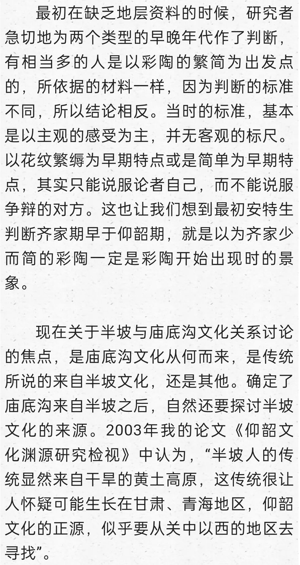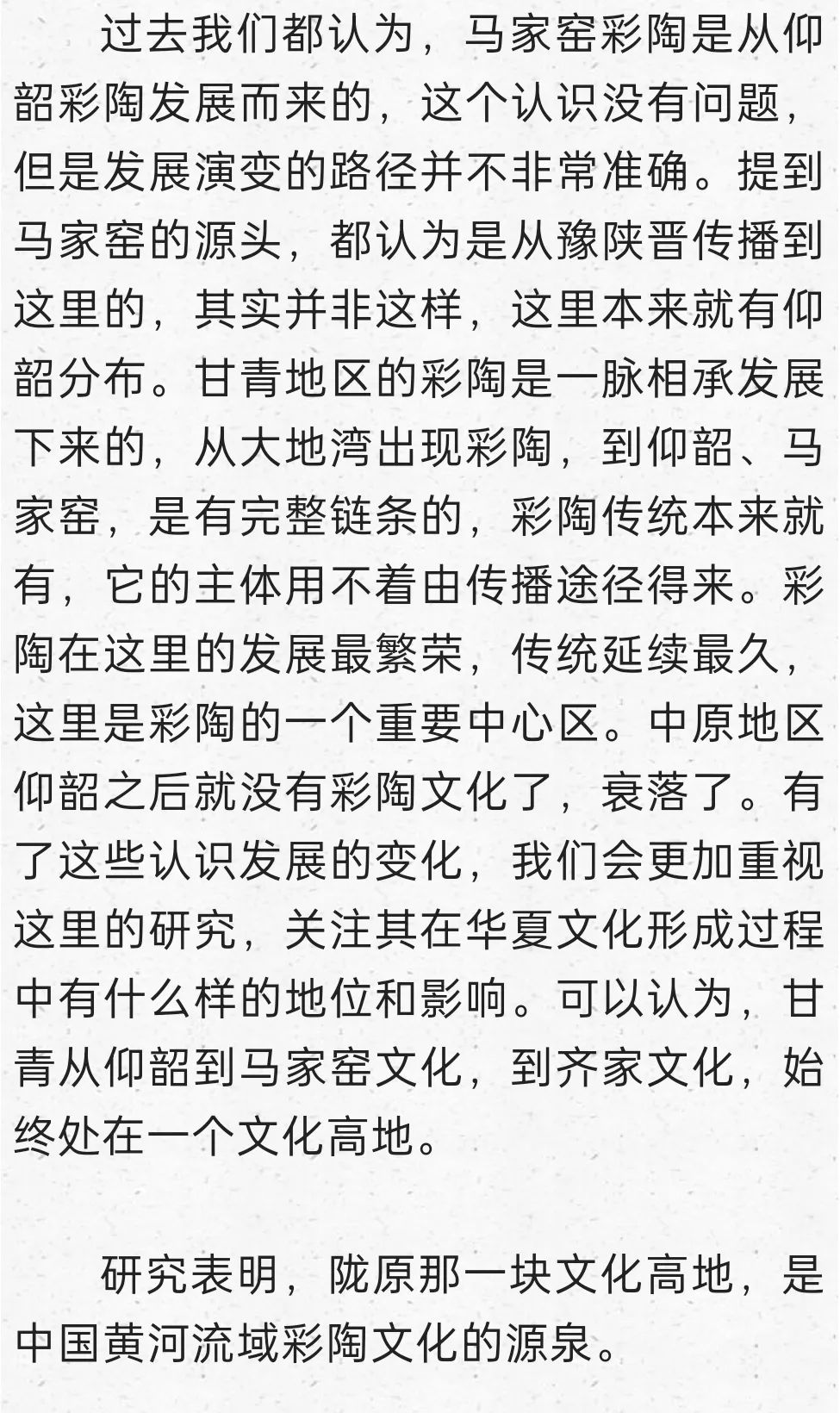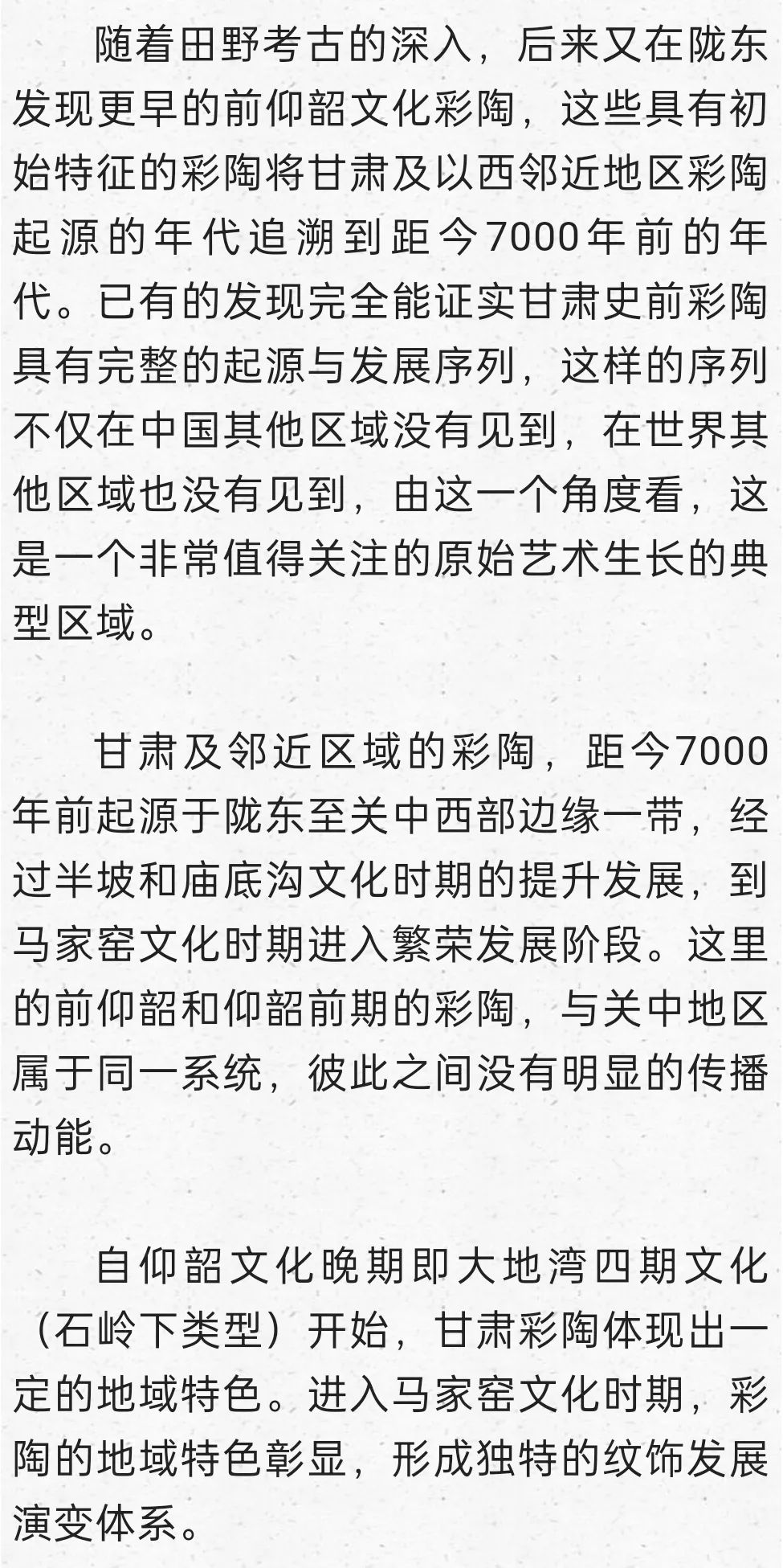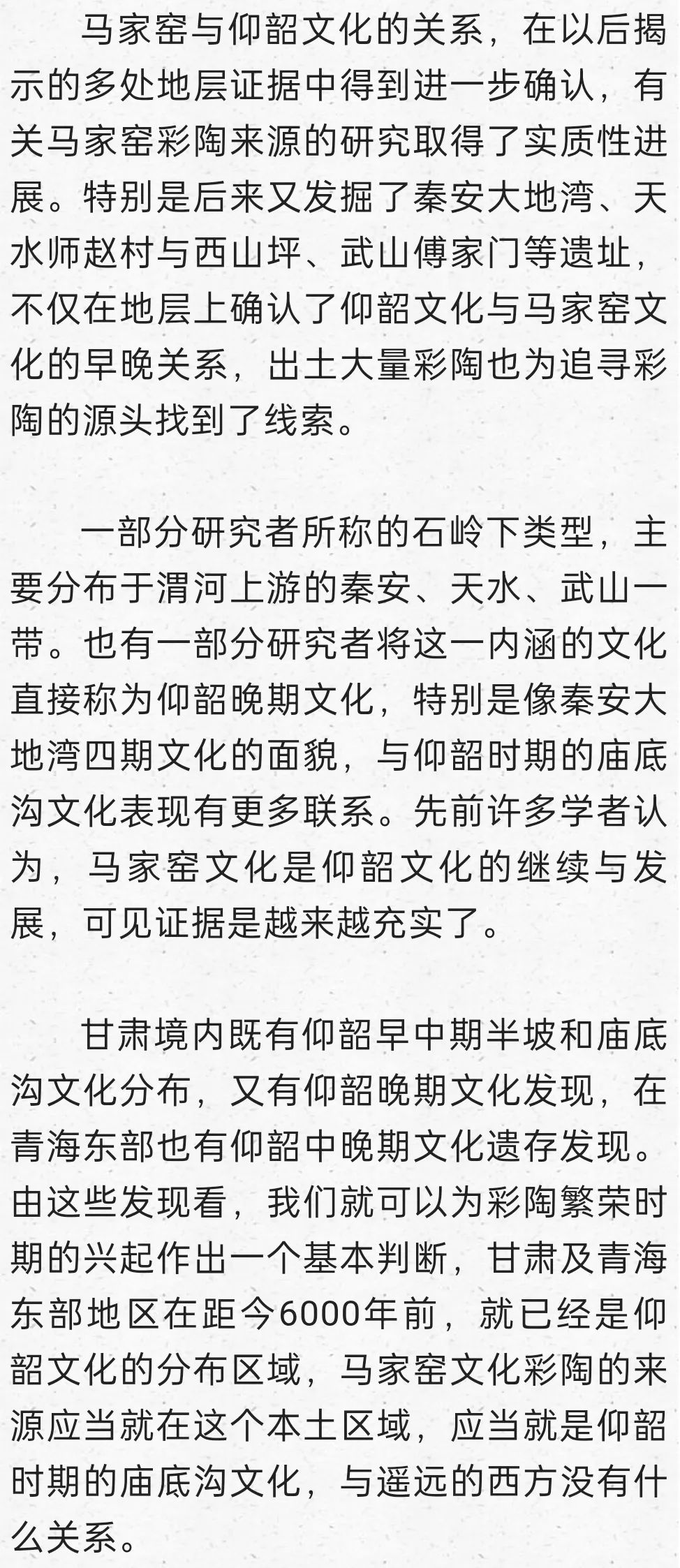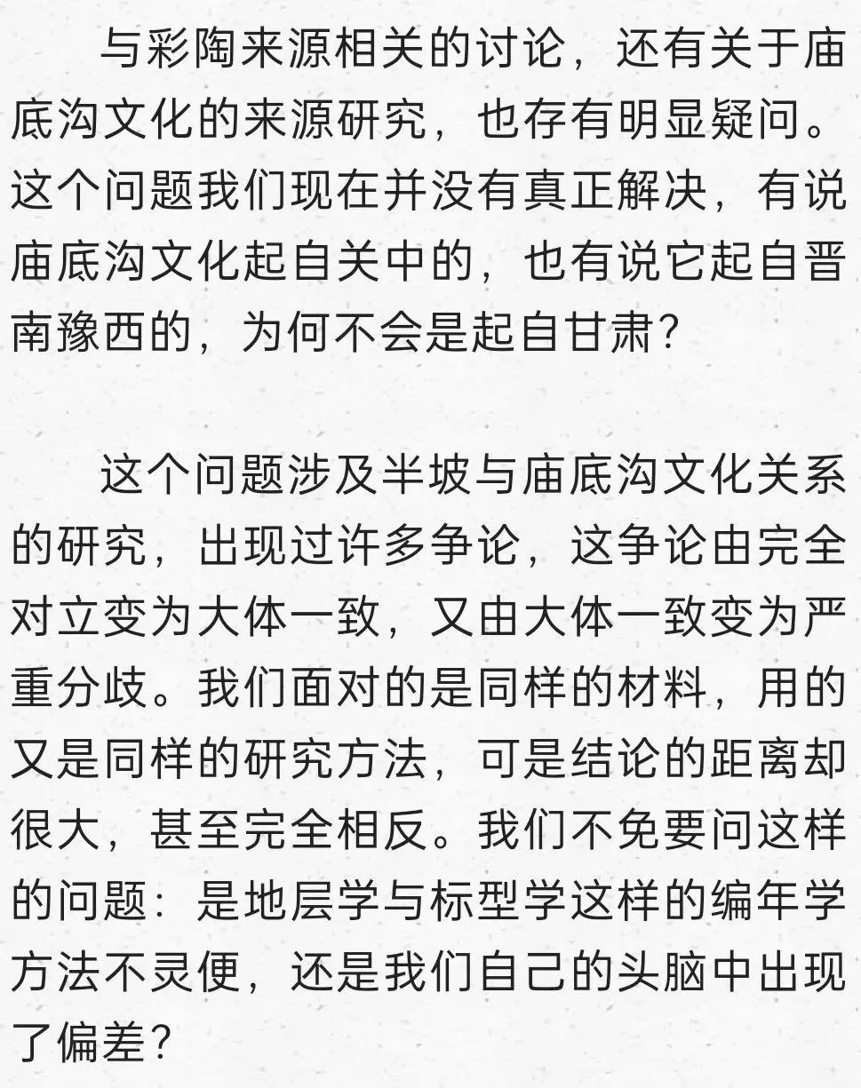 在這里明確提出到甘青尋找仰韶文化的正源,后來我又寫成《秦安大地灣遺址彩陶研究》,討論甘青彩陶的序列,也表達(dá)了類似觀點(diǎn):“甘肅及青海東部地區(qū)在距今6000年前左右,就已經(jīng)是仰韶文化的分布區(qū)域,馬家窯文化彩陶的來源應(yīng)當(dāng)就在這個(gè)本土區(qū)域,應(yīng)當(dāng)就是仰韶時(shí)期的廟底溝文化。從文化的分布與地層堆積關(guān)系找到了甘肅地區(qū)考古學(xué)文化明確的傳承關(guān)系,由彩陶紋飾演變的考察也能尋找到傳承的脈絡(luò)”。