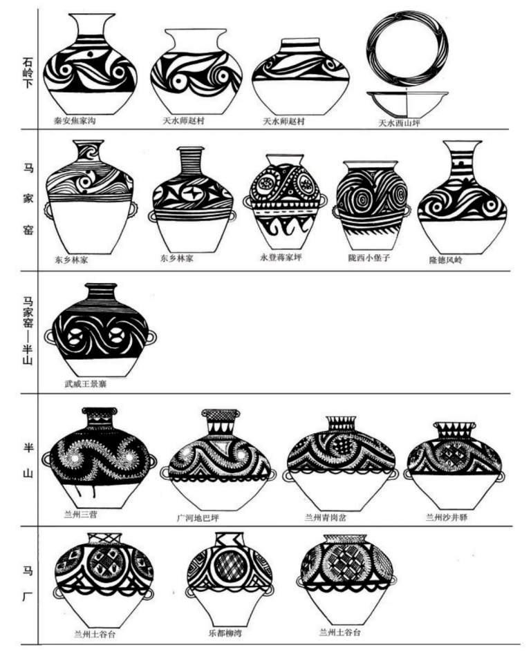 在20世紀(jì)五六十年代,在甘肅及鄰近的青海東部地區(qū)新發(fā)現(xiàn)大量的馬家窯文化遺址,同時(shí)也進(jìn)行了一些發(fā)掘工作,為探索馬家窯文化及彩陶的來源進(jìn)行了深入研究。關(guān)于馬家窯文化與仰韶文化的關(guān)系,體現(xiàn)在彩陶上的線索非常明確,石興邦先生就此進(jìn)行了探討,他在1962年發(fā)表的一文中認(rèn)為馬家窯文化彩陶受到廟底溝類型彩陶的影響,紋飾母題與演變規(guī)律都有相似之處。嚴(yán)文明先生1978年發(fā)表的《甘肅彩陶的源流》,論及半坡類型向隴東和廟底溝類型向隴西及青海東部的擴(kuò)展,認(rèn)為馬家窯文化彩陶的源起與中原地區(qū)的仰韶文化有關(guān)。