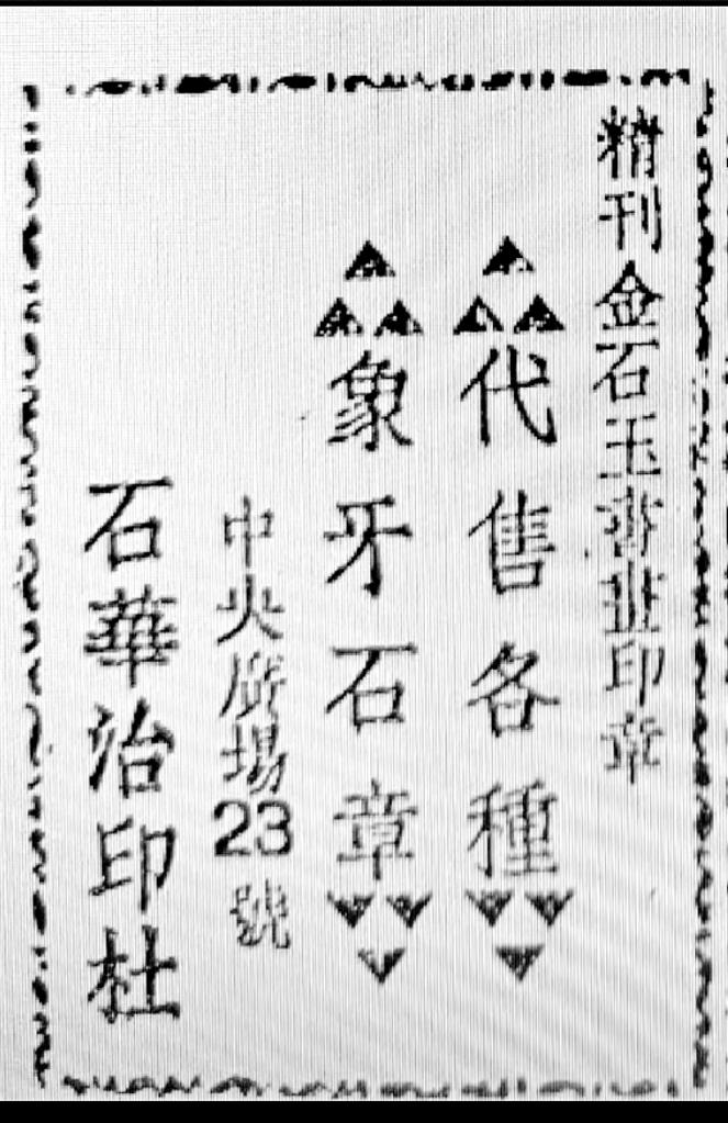 最后要提到的一則廣告也與文化有關(guān)。蘭州和平日?qǐng)?bào)社1947年出版的《新蘭州》一書中,曾刊登石華治印社廣告,其廣告詞曰:“精刊金石玉書畫印章、代售各種象牙石章”,社址在中央廣場(chǎng)23號(hào),其創(chuàng)辦者即為隴右印壇名宿駱石華先生。駱石華先生1920年生人,彼時(shí)未及而立,尚未入白石先生門下;筆者家外祖解放前供職中央廣場(chǎng)郵局,當(dāng)年曾與石華先生相交。今偶于舊籍中覓得石華治印社當(dāng)年廣告,恭錄于此,既為本文收尾,亦為家外祖與石華先生半個(gè)世紀(jì)友誼之緬懷。