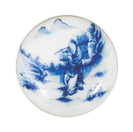 一件是青花印泥盒,制作于20世紀(jì)初。直徑7厘米,高3厘米,盒身扁圓,鼓腹,上下相合。盒蓋用青花繪“樵夫讀書”圖。畫面遠(yuǎn)處,兩座山峰高聳云間,四周樹木蔥蘢,山石嶙峋。畫面正中的山路上,一樵夫砍柴歸來,身背一大捆柴草,他右手扶著木棍,左手則捧著一本書,雙眼盯著書本,緊抿嘴唇,正津津有味地邊走邊讀。讀到精彩處,露出會(huì)心一笑。看來,這個(gè)樵夫是極愛讀書的,這種好學(xué)精神,難道不值得我們學(xué)習(xí)嗎?這件瓷印泥盒,青花色澤典雅,人物衣褶神態(tài)描繪細(xì)致,栩栩如生,胎體堅(jiān)致,白釉溫潤(rùn),層次清晰,保存完好。