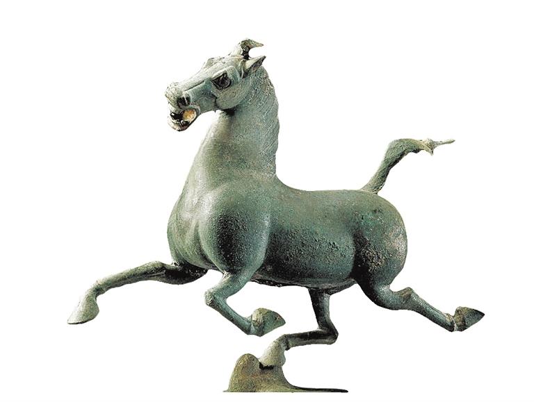 注定不平凡的銅奔馬,終究迎來(lái)了屬于它的高光時(shí)刻——這匹馬,三足騰空,作昂首嘶鳴狀,正疾足奔馳……銅奔馬矯健的體態(tài)于奔馳中彰顯出一股強(qiáng)勁的力量,這股力量穿過(guò)身上的毛孔而酣暢釋放,這使得它腳下那只飛鳥也不禁吃驚且崇拜地回眸張望。