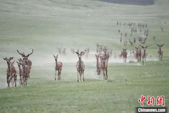 夏日時(shí)節(jié),位于祁連山北麓的甘肅省張掖市肅南裕固族自治縣,數(shù)百頭馬鹿在草原上崩騰、休憩覓食?!钇G敏 攝