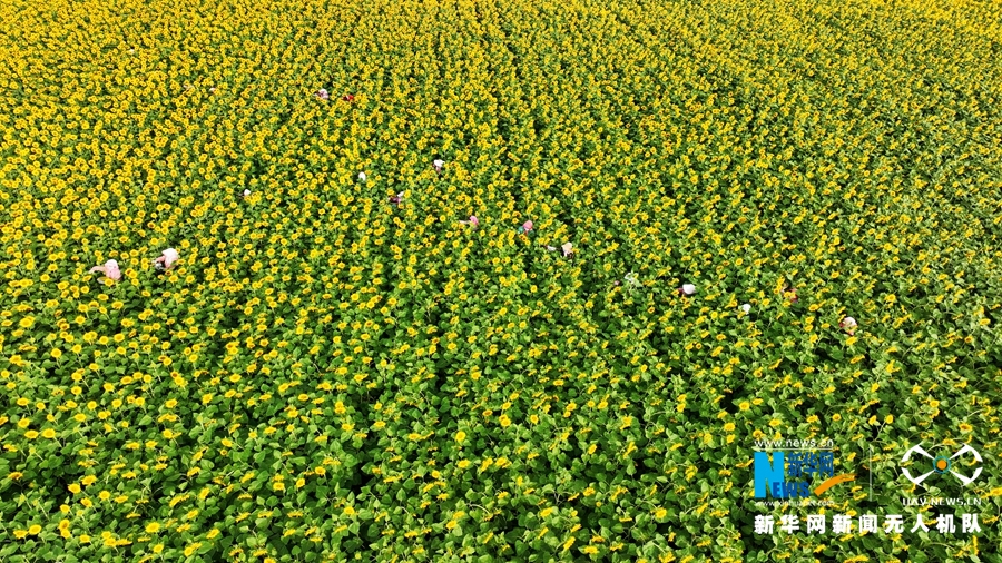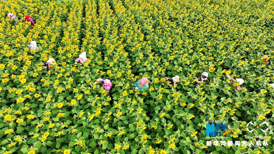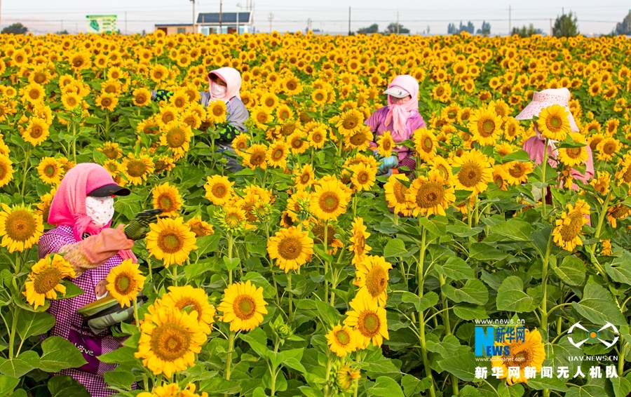 7月23日,甘肅省張掖市臨澤縣新華鎮(zhèn)長(zhǎng)莊村近千畝制種向日葵盛開(kāi),金色花海里數(shù)十名葵農(nóng)忙著為向日葵授粉。新華網(wǎng)發(fā)(成林 攝)