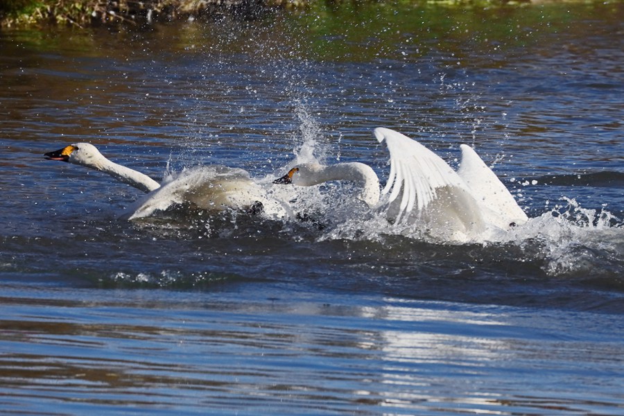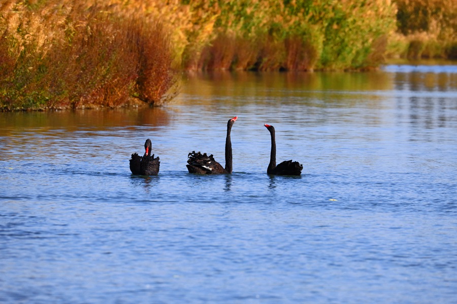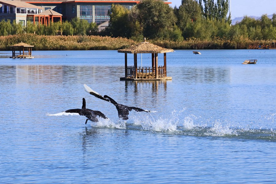 張掖國(guó)家濕地公園內(nèi),天鵝聚集在一起嬉戲。方艾琴攝