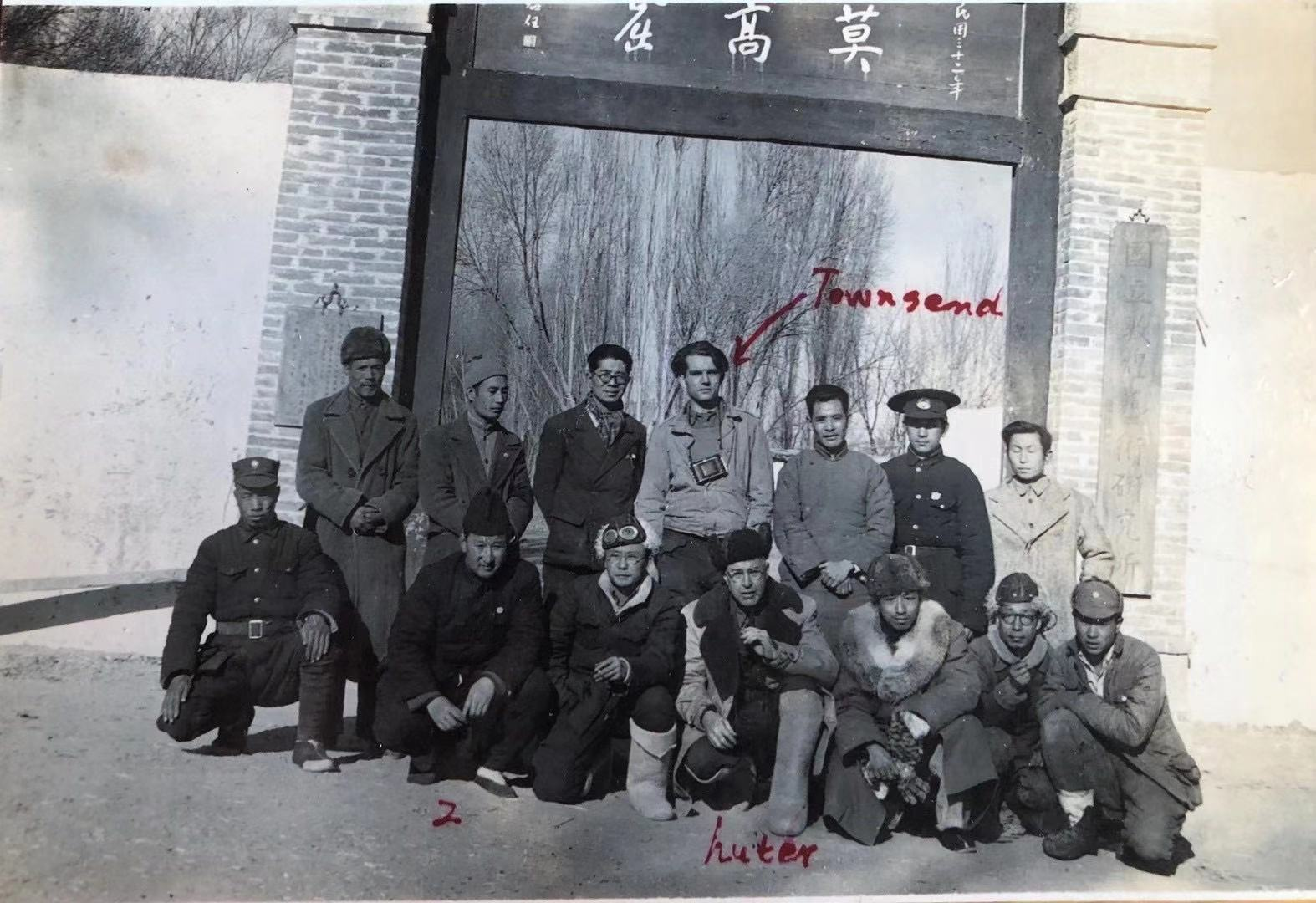 1945年4月張官廉(前排左三)陪同英國(guó)議員、英國(guó)消費(fèi)合作社總社負(fù)責(zé)人胡特(后排中)考察山丹培黎學(xué)校期間在敦煌莫高窟前合影