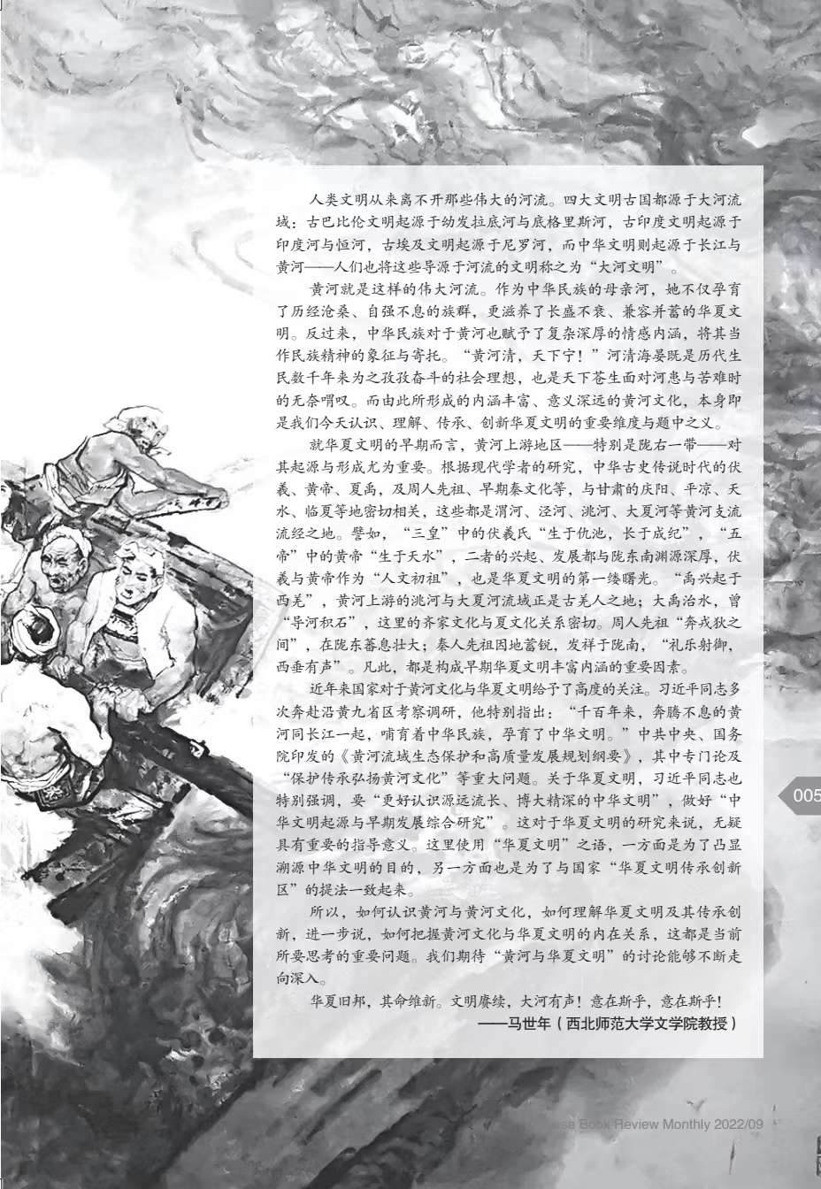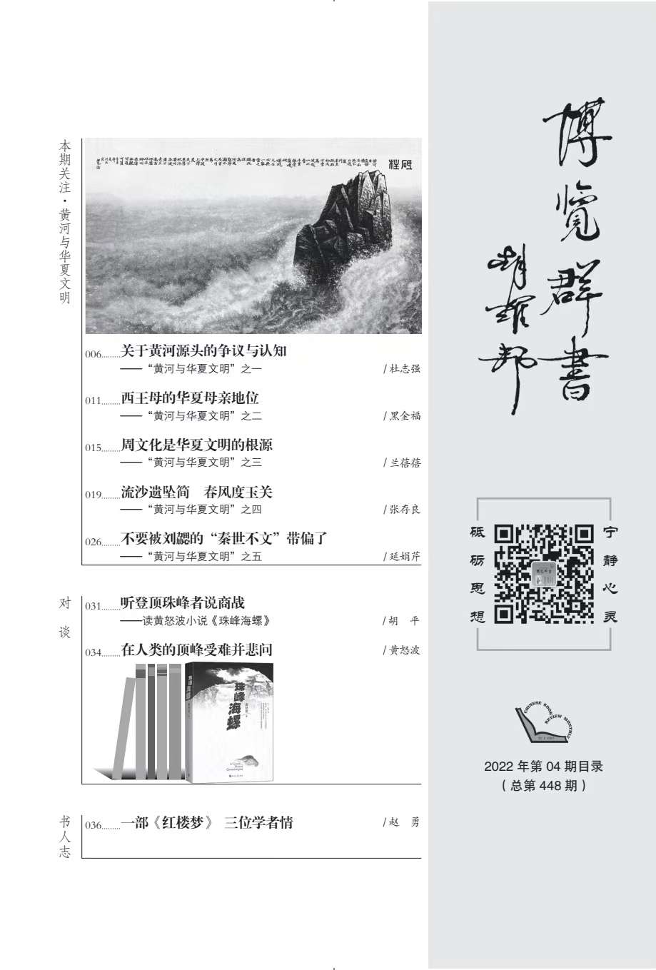 “黃河與華夏文明”系列文章(共9篇),由《博覽群書》編輯部邀約西北師范大學(xué)文學(xué)院馬世年、杜志強(qiáng)等著名專家策劃、組稿,作者有馬世年、杜志強(qiáng)、張景平、延娟芹、張存良、黑金福、劉陽杰、蘭蓓蓓等,分別刊發(fā)于《博覽群書》2022年3期、9期。系列文章著眼黃河文化,呼應(yīng)中央關(guān)于研究黃河文化的號(hào)召,探討華夏文明在黃河流域的發(fā)展、發(fā)生與傳承、創(chuàng)新;同時(shí),欄目通過精準(zhǔn)立意、深入考證和生動(dòng)表達(dá),卓有成效地推介和普及了黃河文化,深化了國人對(duì)黃河文化的認(rèn)識(shí)。已經(jīng)探討的相關(guān)論題有:歷史上關(guān)于黃河起源的爭(zhēng)議,黃河文化的內(nèi)涵,先周文化,秦早期文化,民族文化,西王母文化,絲路文化等。據(jù)《博覽群書》雜志介紹,鑒于這一主題的人文價(jià)值和巨大影響,編輯部將和學(xué)界更加密切配合,加強(qiáng)相關(guān)欄目,講好學(xué)術(shù)故事,推動(dòng)黃河文化研究形成新局面和新氣象。