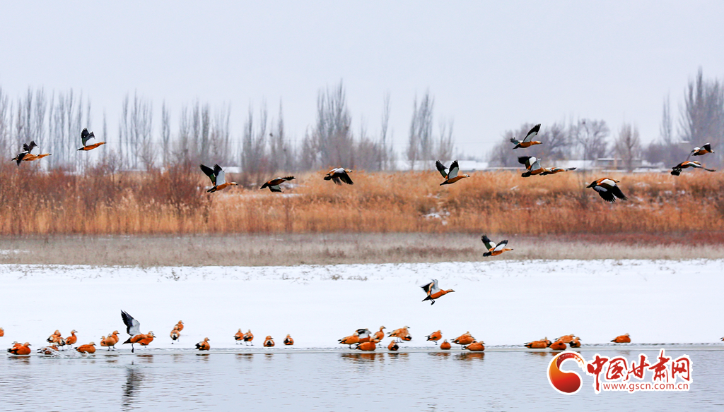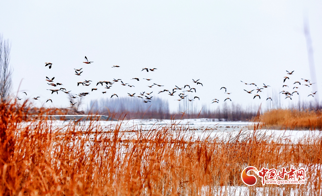 12月20日,在甘肅省酒泉市銀達(dá)鎮(zhèn)花園水庫(kù),一群候鳥正在戲水、覓食,為祁連山下的戈壁大地增添了一道亮麗的景色。