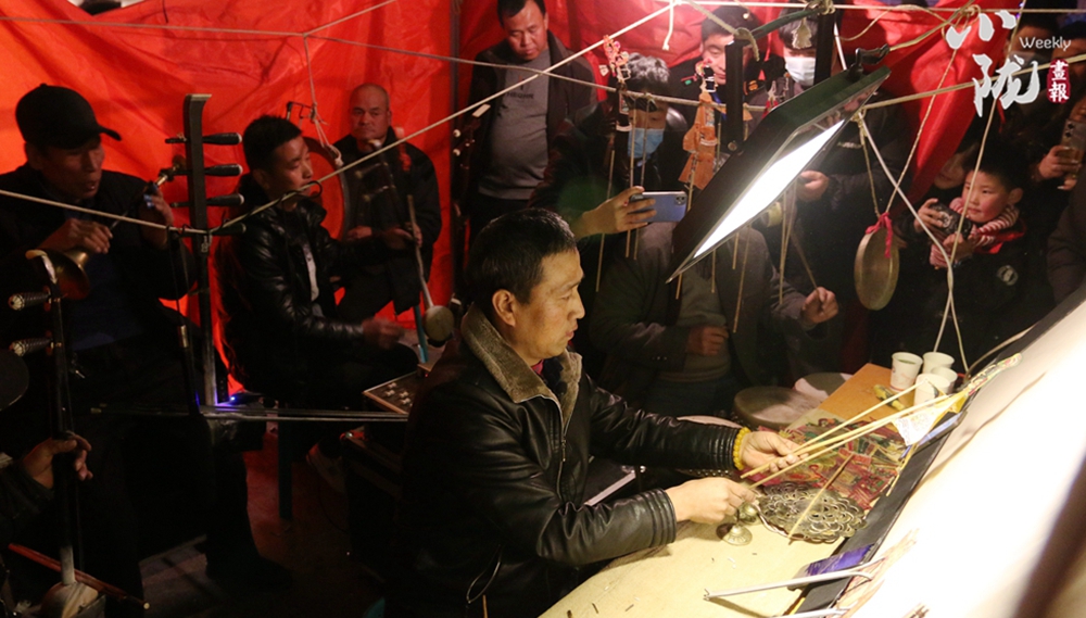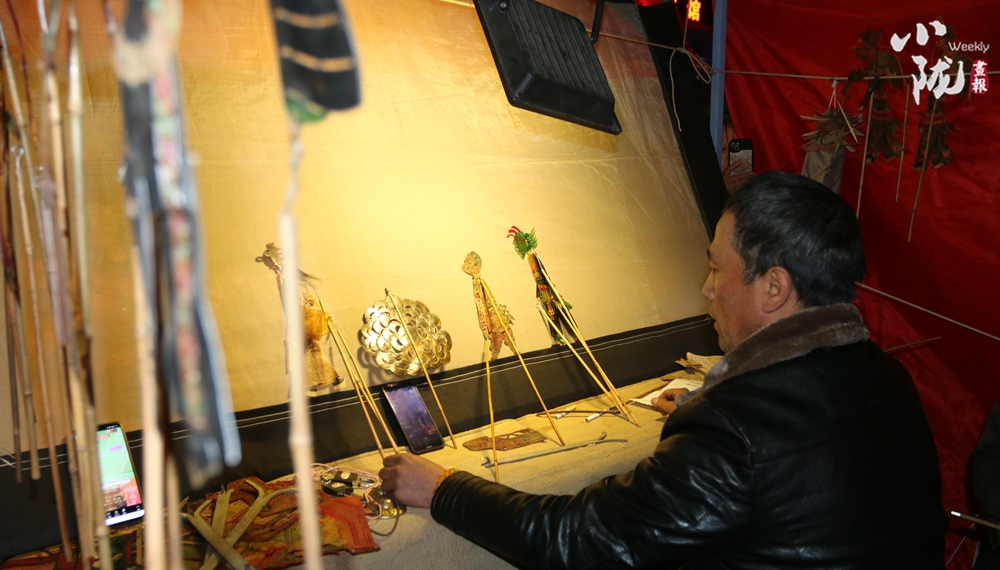 一張幕布、兩盞白熾燈、四五老藝人、七八件簡(jiǎn)單樂器,藝人在白色幕布后面,一邊用手操縱戲曲剪紙人物,一邊用本地流行曲調(diào)唱述故事,同時(shí)配以器樂以增加演戲氣氛。