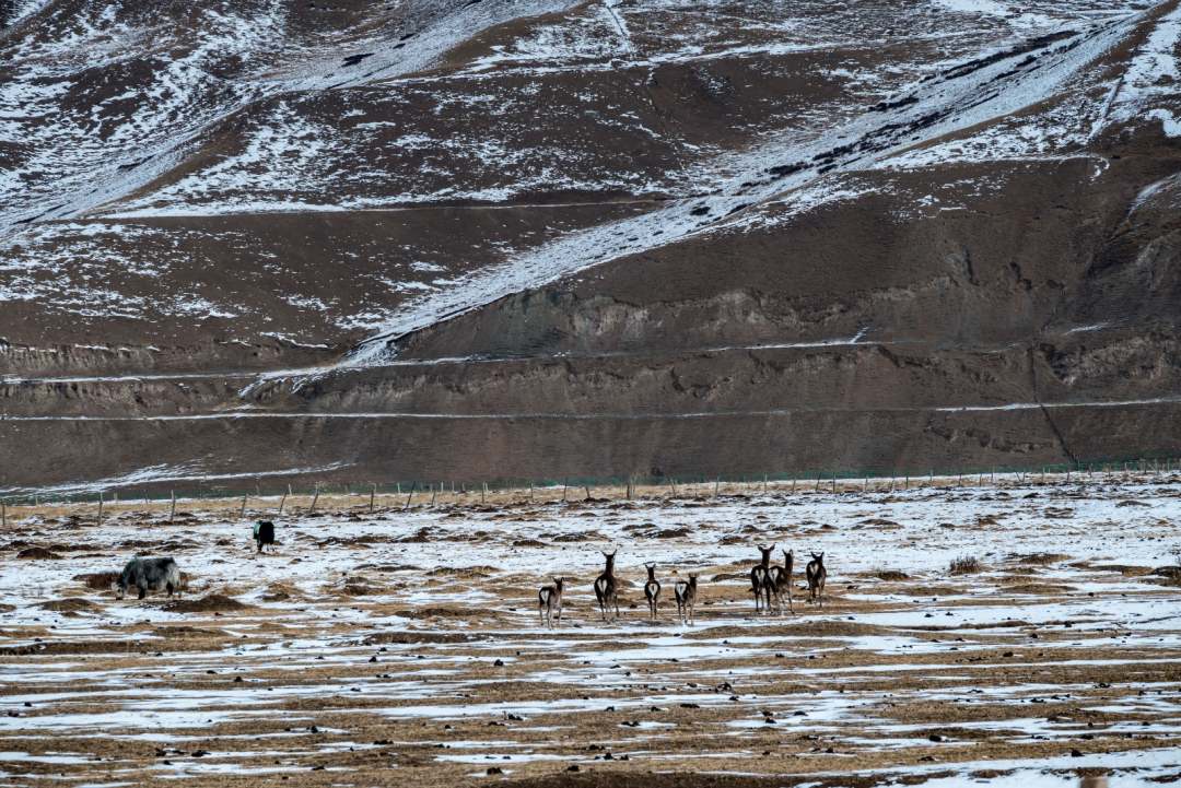 近日,在武威市天祝藏族自治縣抓喜秀龍草原上,野生的狍鹿和牧民家養(yǎng)的白牦牛同食牧草,構(gòu)成一幅和諧動(dòng)人的自然圖景。張廷愛(ài)攝。