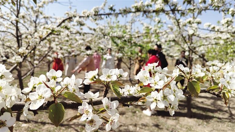 清新的花香映紅了游客的笑臉,有人在梨花樹下翩翩起舞,有人在梨花叢中游覽拍照,有人在梨花樹下放聲歌唱。梨花詩會(huì)如期舉辦,配樂詩朗誦《千古涼州》、藏族舞蹈《故鄉(xiāng)》、合唱《祝福祖國》、旗袍秀《飛韻江南》等眾多節(jié)目吸引了游客的目光。連日來,涼州區(qū)西營(yíng)鎮(zhèn)2200畝梨花競(jìng)相綻放,遠(yuǎn)處蜿蜒起伏的祁連山和眼前雪花般紛紛揚(yáng)揚(yáng)的梨花構(gòu)成了一幅美麗的鄉(xiāng)村畫卷。