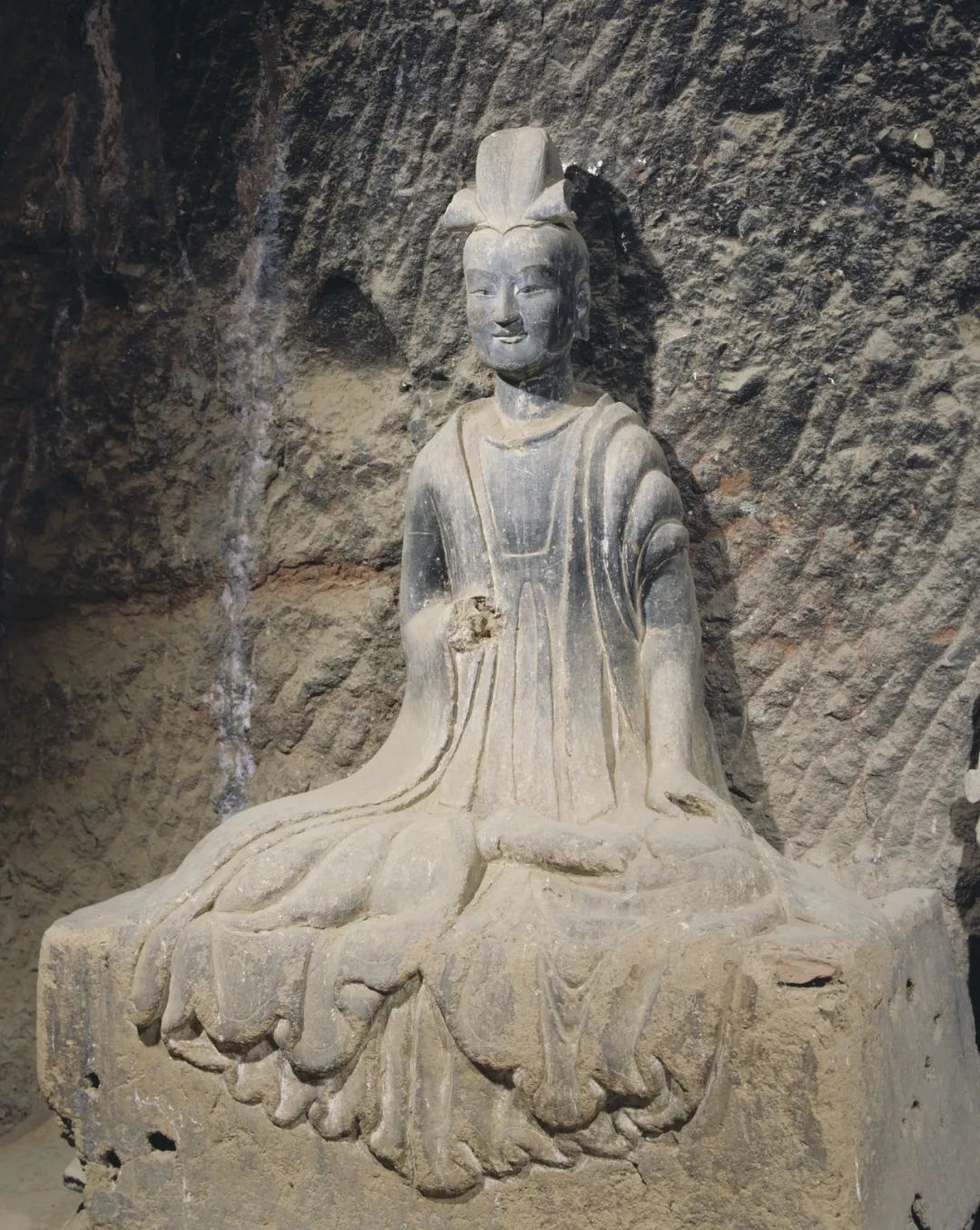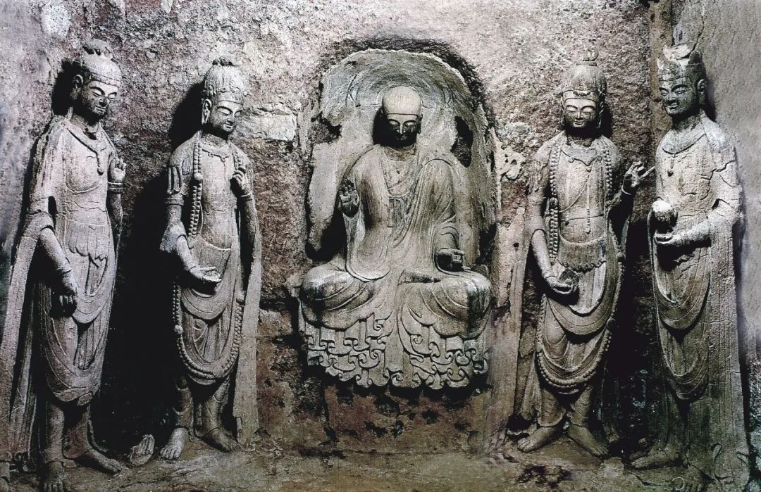 它一改西魏造像繁縟華麗、服飾厚重的特點,無論是佛、菩薩、弟子,還是飛天和力士,服飾輕柔而貼體,均展現(xiàn)出一種雄健挺拔、恬靜自然的氣韻,面相方圓,五官清秀而緊湊。佛低平肉髻,身穿圓領通肩或垂領式袈裟,衣裾下擺緊貼佛座,陰刻圓潤流暢的褶皺紋。菩薩也由束發(fā)高髻改為頭戴花冠,周身飾瓔珞,體姿婀娜而不失端莊。