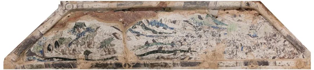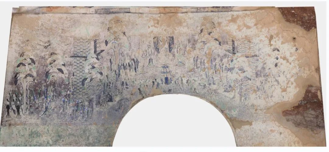 隋唐時期是麥積山石窟歷史上的一個重要轉(zhuǎn)折階段,根據(jù)對麥積山崖面現(xiàn)存窟龕綜合考察分析,可知到北周時,壁面上已是窟龕密布,幾乎已經(jīng)沒有多少可供利用的位置。這一時期現(xiàn)存窟龕主要有第5、8、10、13、24、37等窟,多為隋代開鑿。其中第5窟完成于初唐,繪制于右側(cè)大龕外壁上方的西方凈土變,場景壯觀、人物眾多,是唐代壁畫的杰出之作。