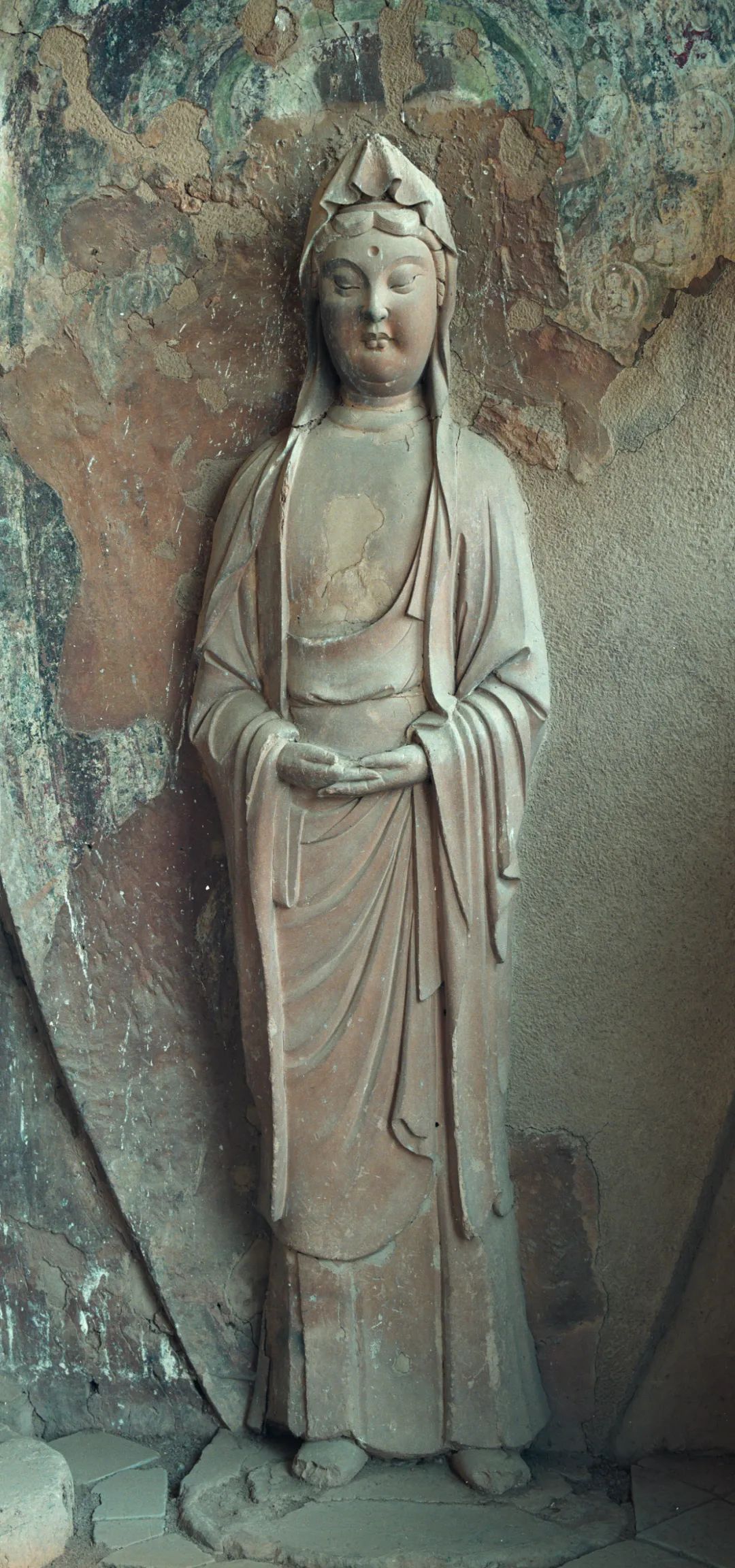 相傳第43窟就曾是這位美麗而賢惠的皇后的寢陵。西魏造像在北魏晚期秀骨清像的基礎上,面部神態(tài)及身材又趨于飽滿挺拔,給人一種寧靜慈祥的感覺。人物服飾依然保留著褒衣博帶風貌,但服裝質(zhì)感厚重,層次繁縟清晰,線條流暢分明,質(zhì)樸而不失奢華,一股清新之風撲面而來。