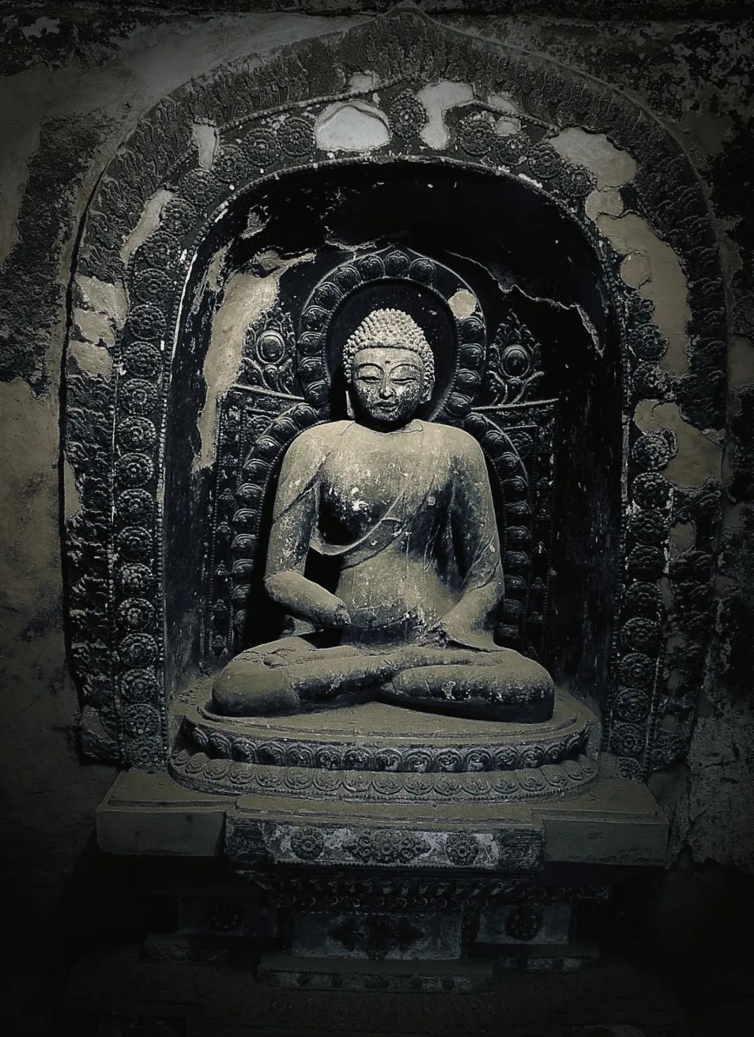 從題材上看,以單尊佛、菩薩、力士等為主,風格上更具有寫實性。造像面相橢圓飽滿,斜眉吊目,懸鼻小口,表情森嚴、凝重,服飾簡潔、質(zhì)樸,寬博厚重,極富質(zhì)感。其中佛低平螺髻,前置肉髻珠,身穿垂領袈裟。菩薩束發(fā)高髻或戴風帽,眉目慈祥,身材比例協(xié)調(diào)、準確。力士表情生動傳神,體形孔武雄健,充滿陽剛之氣,給人以強烈的力量和威武感;這段時間造像前衰后盛也與當時秦州所處環(huán)境有密切關系。