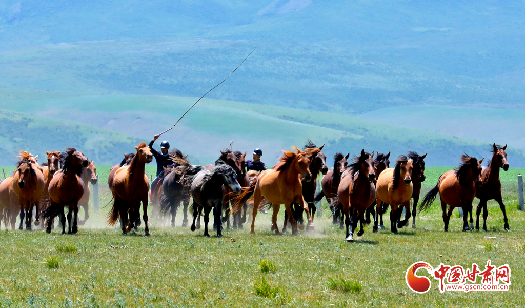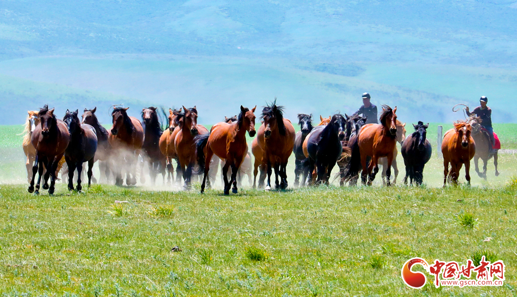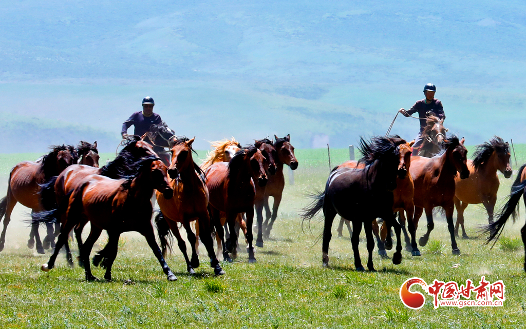 7月25日,位于祁連山北麓的甘肅省張掖市山丹馬場(chǎng)駿馬奔騰,吸引了眾多游客駐足觀賞。