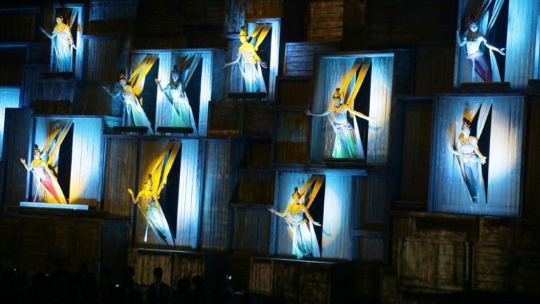 活化敦煌古樂(lè)器、古樂(lè)譜研發(fā)成果的《樂(lè)動(dòng)敦煌》,采用全息投影、3D威亞等高科技手段,以全沉浸式的呈現(xiàn)方式,演繹了西域少年白氏追尋藝術(shù)的動(dòng)人故事,劇中運(yùn)用了來(lái)自敦煌壁畫(huà)中復(fù)原的五弦琵琶、排簫、蓮花阮等16件古樂(lè)器,演繹了胡旋舞、腰鼓舞、琵琶舞等多種敦煌舞蹈,還原了敦煌壁畫(huà)中的樂(lè)舞盛景。