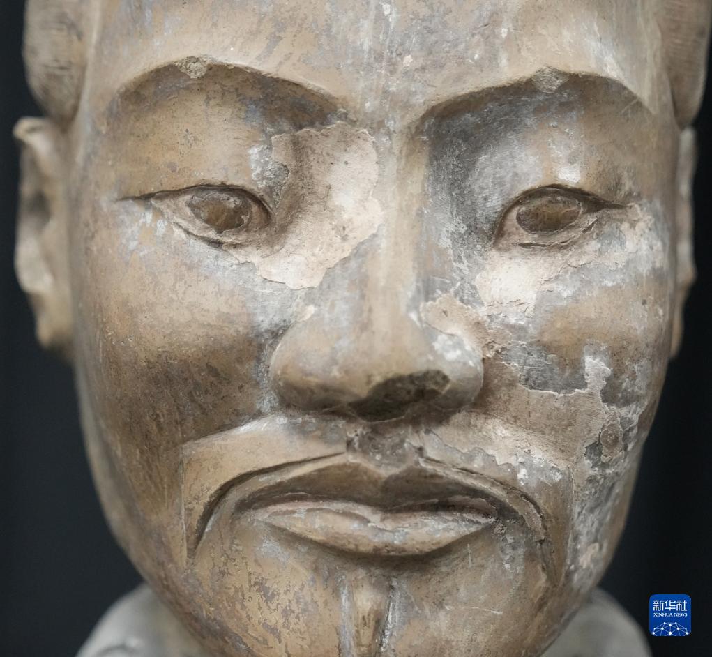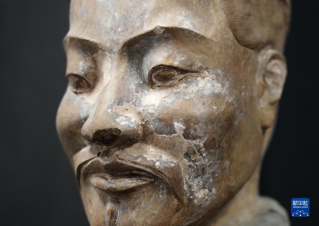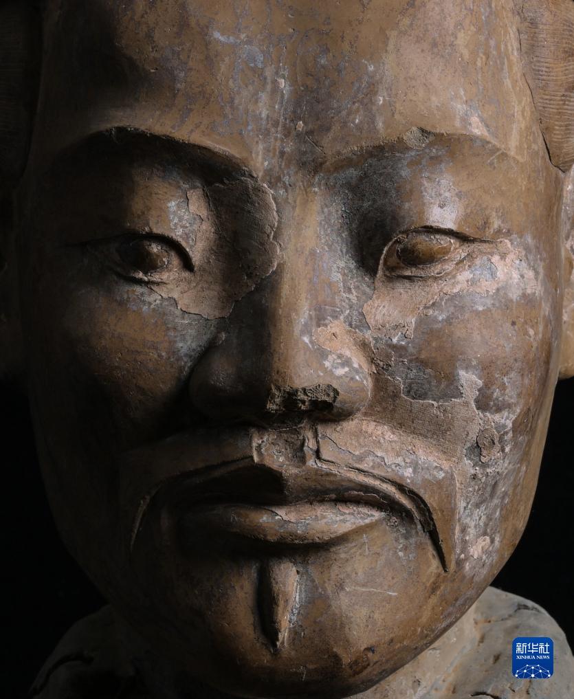 在秦始皇帝陵博物院文物保護部彩色陶俑修復室內(nèi),一尊秦俑臉部尚存部分彩繪層。秦俑五官的精準塑造顯示出秦代匠人具有高超的寫實能力(8月23日攝)。