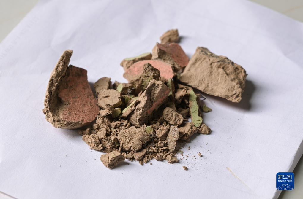 在秦始皇帝陵博物院文物保護部彩色陶俑修復室內(nèi)的工作臺上擺放著發(fā)掘出土的土塊,這些剝落的彩色土塊正等待修復人員采用精湛的技術復原(8月23日攝)。