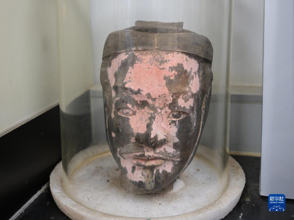 在秦始皇帝陵博物院文物保護部彩色陶俑修復室內(nèi),一尊秦俑臉部尚存部分彩繪層(8月23日攝)。