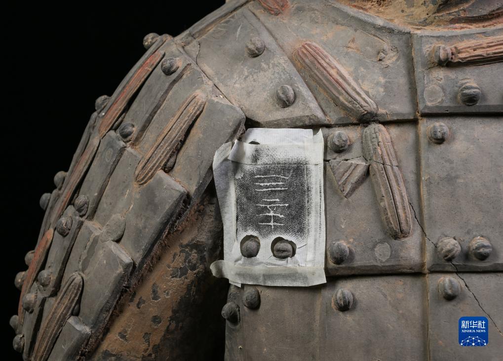 在秦始皇帝陵博物院文物保護部彩色陶俑修復室內(nèi),修復人員使用墨拓技術在一尊秦俑的胸前甲片上還原出“三辛”字樣的刻痕。據(jù)介紹,這應是制作該秦俑的秦代工匠名(8月23日攝)。