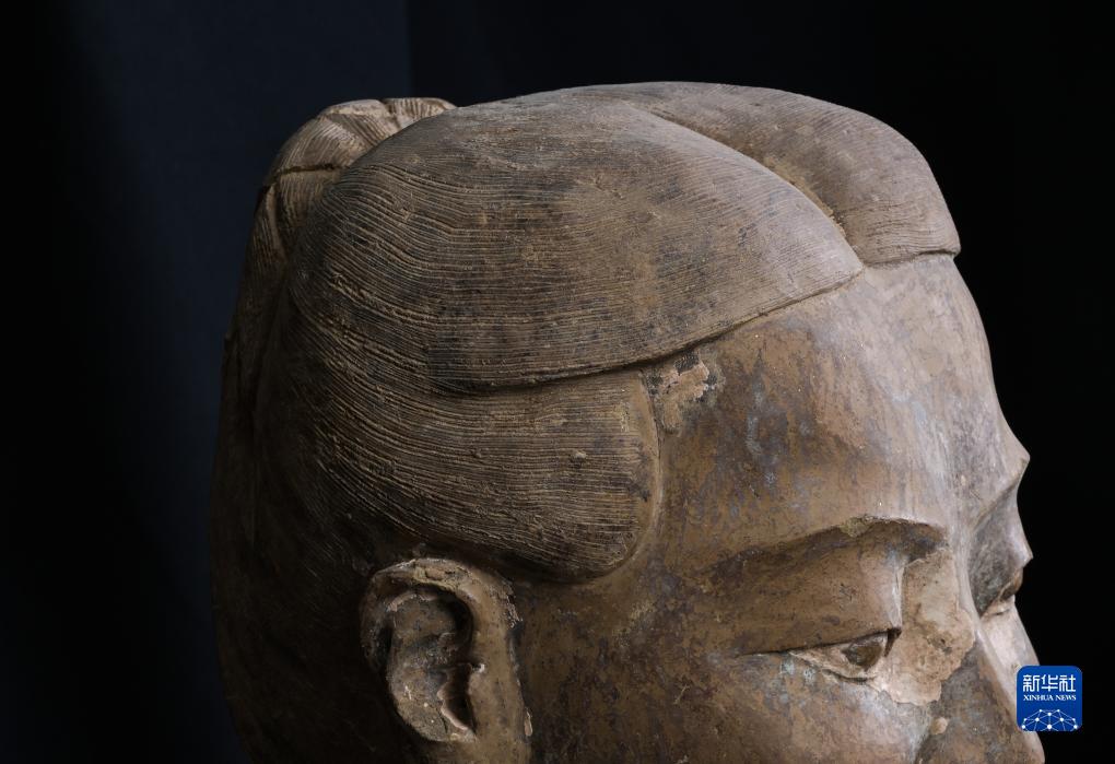 在秦始皇帝陵博物院文物保護部彩色陶俑修復室內(nèi),一尊秦俑的頭發(fā)分毫畢現(xiàn)( 8月23日攝)。