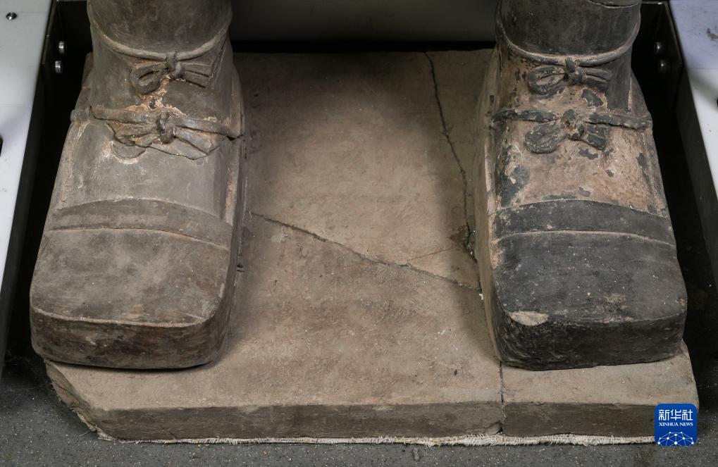 在秦始皇帝陵博物院文物保護部彩色陶俑修復室內(nèi),一尊秦俑的雙腳被工匠塑造出細節(jié)(8月23日攝)。