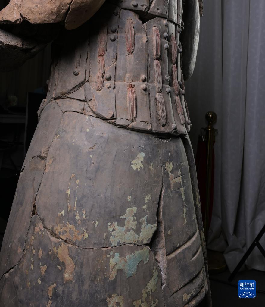 在秦始皇帝陵博物院文物保護部彩色陶俑修復室內(nèi),一尊秦俑身后裙裾部的彩繪顏料層依稀可辨(8月23日攝)。