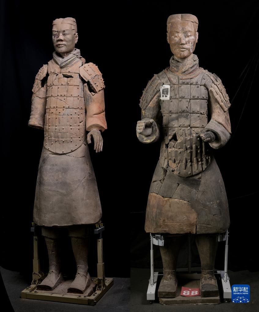 兩尊經(jīng)過修復的彩色秦俑佇立在秦始皇帝陵博物院文物保護部彩色陶俑修復室內(nèi)(拼版照片,8月23日攝)。