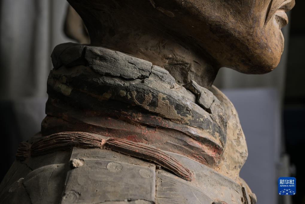 在秦始皇帝陵博物院文物保護部彩色陶俑修復室內(nèi),一尊秦俑衣領處的彩繪顏料層依稀可辨(8月23日攝)。