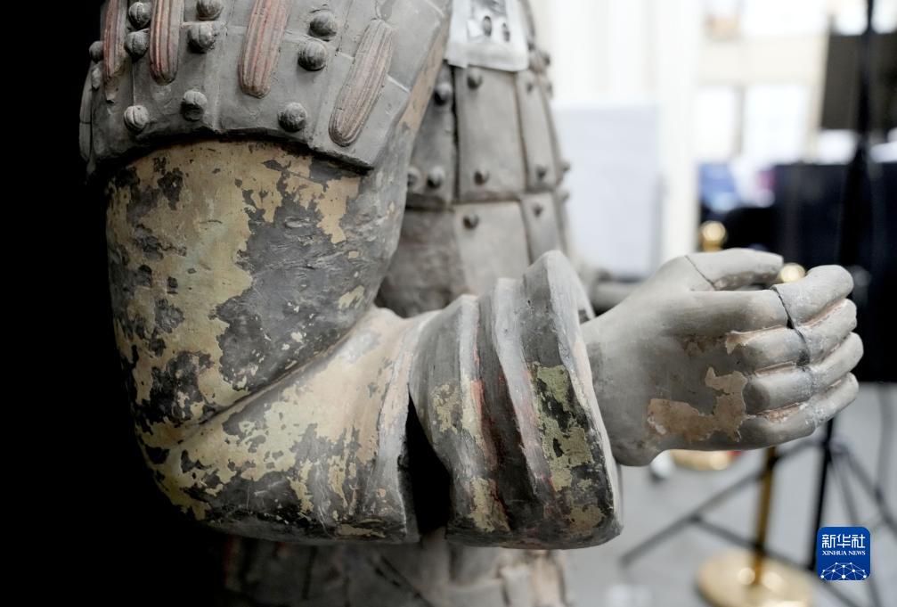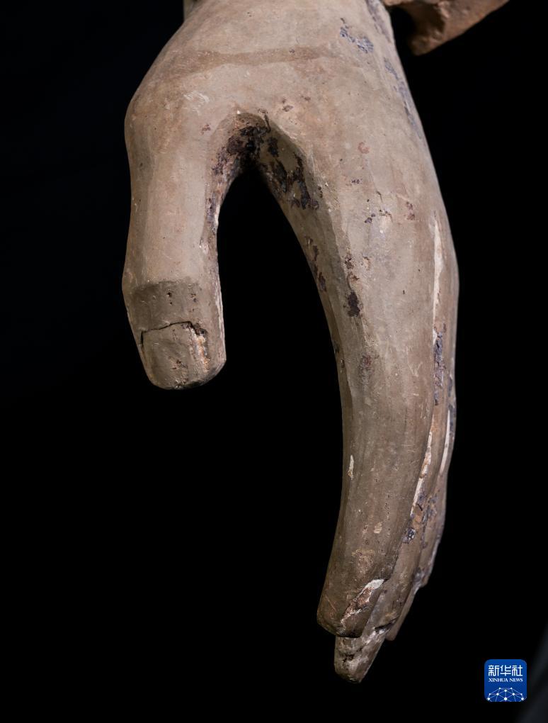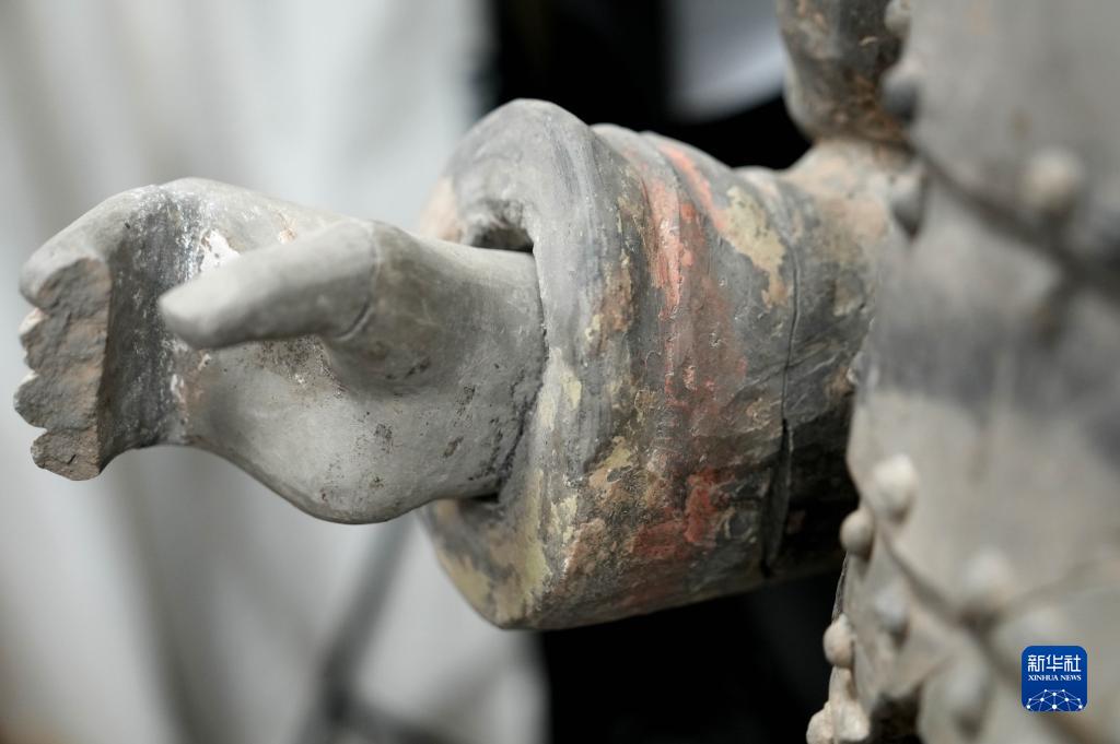 在秦始皇帝陵博物院文物保護部彩色陶俑修復室內(nèi),一尊秦俑的手部特寫顯示出豐富的細節(jié)(8月23日攝)。