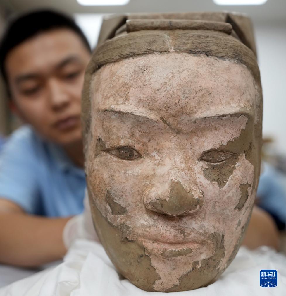 這是秦俑俑頭彩繪還原修復后的樣貌(8月23日攝)。