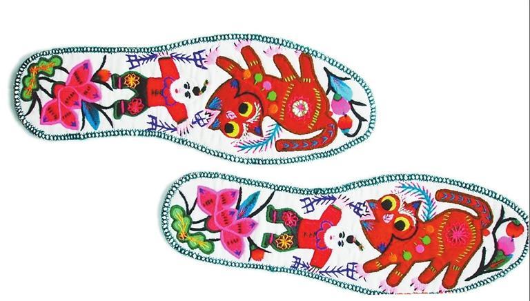 北方黃土高原,陜甘寧晉一帶,采用這種藝術(shù)縫制刺繡的衣物飾品有拼布藝術(shù)的鮮明特征,具有浮雕效果。其具體做法是將貼填繡畫相結(jié)合,有人叫做拼貼浮雕繡,在肚兜、枕頂?shù)鹊闹谱髦羞@種技藝采用最多。因?yàn)槎嗍钦w設(shè)計(jì),分部件制作,然后組合成一個完整的畫面在布上,所以叫“逗”,“逗”是秦隴方言,就是手指把不同部件小心拼合在一起組成圖案的動作,因?yàn)椴计?,要小心仔?xì),輕輕拼合,所以會“逗裹兜”“逗夾襖”的媳婦,就是心靈手巧的人,說一個女性會“逗”,就是對她的女紅技藝的認(rèn)可。