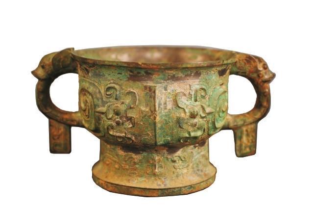 器物保存完整,紋飾十分講究,造型圖案十分精美,為國家一級文物。通高14.6厘米,口徑19厘米,底徑14.3厘米。鑄造工藝在西周時期屬于較為上乘之作。夔紋是圖騰紋飾,《說文》中云:“夔如龍而一足。”簋的兩邊為耳,呈環(huán)狀。上部各有一變形的龍首,顯得十分莊重、大氣。整個器物周身布滿綠銹,脫銹之處露出青銅光澤,透出歷史的厚重之美。