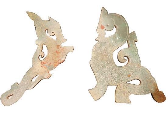 這對戰(zhàn)國谷紋玉龍,一個完整,一個略有殘缺。春秋戰(zhàn)國的龍,龍身很長,蜿蜒曲折,一般成對出現(xiàn)。龍身的裝飾,以谷紋或勾云紋為主,造型較多見的有蟠龍、行龍、虬龍、夔龍。戰(zhàn)國的龍身形態(tài)各異,基本上有個共同特點(diǎn)—“水滴眼”,龍頭多為“連云頭”,廓線出鋒,棱角分明。裝飾上多為陰刻和浮雕工藝。