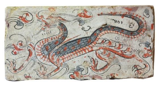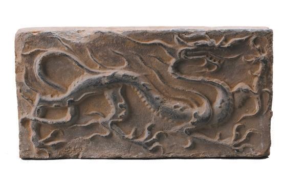 磚面上龍的形象棱角分明,骨架清瘦。龍身前屈后伸,起伏轉(zhuǎn)折,龍首高昂,張口吟嘯。前肢呈登騰狀,后肢做行進(jìn)狀。鬣鬃飛揚(yáng),揚(yáng)爪攪尾,四爪如鷙,整條龍動態(tài)十足,形象逼真,為五代時期模印花磚中的精品。