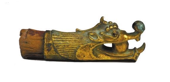 肅南裕固族自治縣馬蹄鄉(xiāng)二夾皮村出土。長19.3厘米,銅質(zhì),鎏金。形狀為龍頭,頸部中空,龍頭部分為獨(dú)角,龍眼暴睜,上唇卷起,口內(nèi)含有一圓球。頸部龍發(fā)呈條形狀。